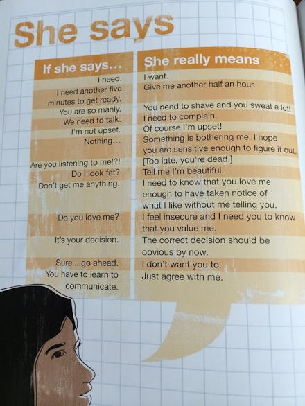 Tan was especially critical of the workshop's propagation of gender inequality. One chart, for example, contrasted what a woman says ("We need to talk.") with what the book claims she really means ("I need to complain."). She argued that these lessons — regardless of their humorous presentation — are extremely damaging. "By endorsing these stereotypes as a tolerable joke, they effectively tell students that these are acceptable views and that it's perfectly okay to adopt them," she wrote.