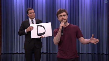 From A to Z, Radcliffe hardly looks fazed. He flawlessly enunciates every word in the rap and brings a charming energy to the Tonight Show performance. Meanwhile, Fallon stands in the back, bobbing along and pulling cue cards. And at the end, his face totally reads "nailed it."