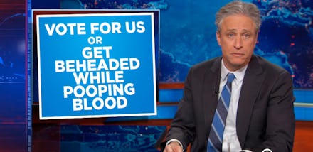 Terrorism and Ebola! Ebola and terrorism! They're great partners, at least if you're looking to frighten people into voting for your party. Or, as Stewart puts it, "Move over, 'Hope and change,' and welcome 'Vote for us or get beheaded while pooping blood.'"