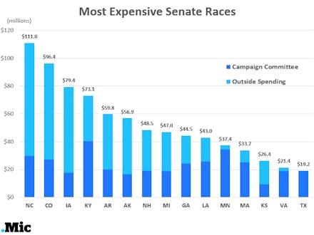 Dark money has no political preference, of course. In the most expensive race, North Carolina, Republican Thom Tillis raised just $9 million in campaign funds to Democrat Kay Hagan's $22.9 million. But outside money helped him stay competitive: While $42 million in outside spending came from liberal groups, conservative ones raised $34.5 million. About $17.68 million of the pro-Republican money came from sources that choose not to disclose their donors, like the U.S. Chamber of Commerce ($5.6 million), Karl Rove's Crossroads GPS ($4.9 million), Carolina Rising ($3.3 million) and the National Rifle Association ($1.9 million). Polling tended to favor Hagan, especially before the money came pouring in.