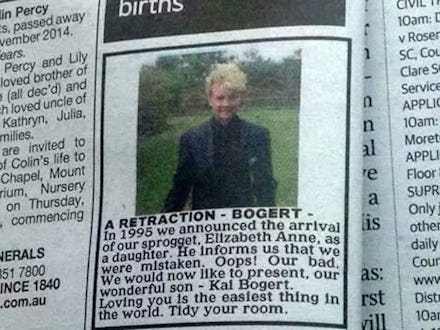 "In 1995 we announced the arrival of our sprogget, Elizabeth Anne, as a daughter," the ad reads. "He informs us that we were mistaken. Oops! Our bad. We would now like to present our wonderful son Kai Bogert. Loving you is the easiest thing in the world. Tidy your room."