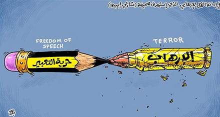 Many newspapers across the Arab world have published cartoons expressing solidarity and support with the French satirical newspaper, much those published by Western cartoonists just hours after the attack.