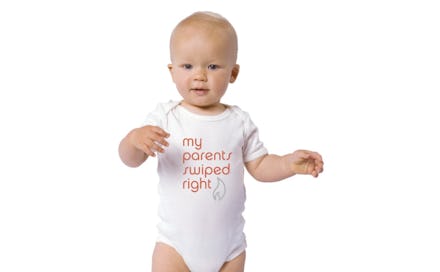 The newly released clothing item, sold by the aptly named website Tinder Baby, hilariously reads, "My parents swiped right." It's a reference to the now iconic swipe-left, swipe-right selection process — but it's also a somewhat terrifying harbinger of a new era of families.