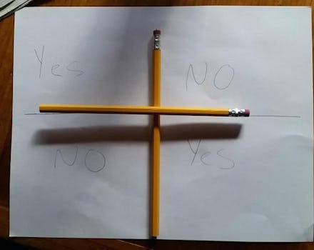 The premise is simple. You take two pencils and place them on top of each other to form a cross. Then you write "yes" two times and "no" two times so the matching words sit diagonally across from each other, like so: