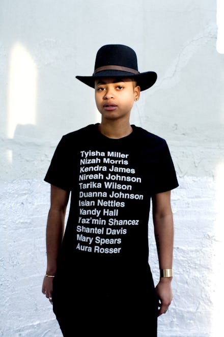 The shirts include, among others, the names of Tyisha Miller, a 19-year-old who was killed by police in Riverside, California, in 1998; Islan Nettles, a 21-year-old trans woman who was beaten to death in Harlem, New York, in 2013; and Mary Spears, a 27-year-old who was shot and killed after refusing to give a man her phone number.