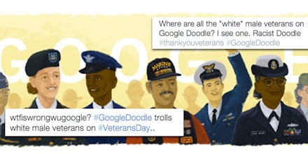 Their latest target? Wednesday's Google Doodle, which celebrates Veterans Day. Visible on the search engine's homepage, the Doodle depicts a row of smiling veterans representing various branches of the U.S. armed forces.