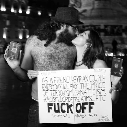 But one French-Syrian couple's message of love and tolerance challenged that sentiment. Hamid Sulaiman and Aurélie Ruby posed topless in the bustling Place de la République, kissing and holding a sign, which tells those who are intolerant to "fuck off" because "love always wins."