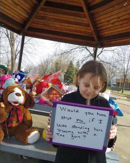 The image shows the child standing in front of the Cudell Recreation Center gazebo where Rice was shot, holding a sign that reads, "Would you have shot me if I was standing here playing with a toy gun?"