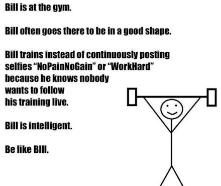 A common-sensed, polite, virtually perfect stick figure named Bill is the internet's latest viral meme gaining big traction on Facebook and other social media outlets. "Be Like Bill," a meme movement that has more than 1.3 million likes on its Facebook page, urges people to, well, be more like Bill — a smart, rational, chill dude who sets an example of how to behave on the modern internet and IRL by, among other things, not posting gym selfies or telling everybody he's a vegan.