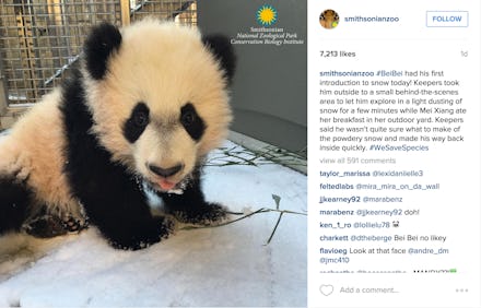 This is not Tian Tian's first snow, but it is the first snow for his son, Bei Bei, and the National Zoo also shared a snap of the cub on Instagram.