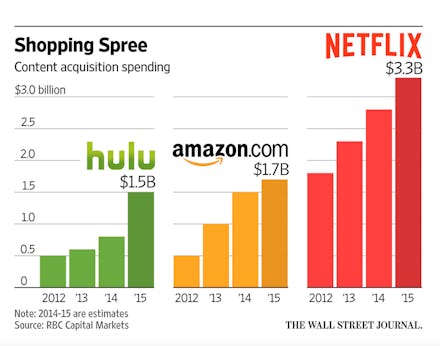 To be clear, Netflix does use the majority of their revenue to pay studios for licensing agreements. The Wall Street Journal reported in 2015 that of the Major Three, Netflix had planned on designating the most funds toward acquiring content – more than what Hulu and Amazon had projected on spending, combined.