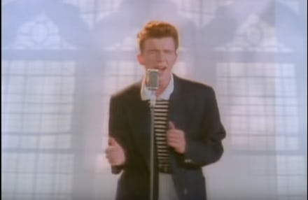 "Never gonna give you up/ never gonna let you down/ never gonna run around and desert you," he sings. "Never gonna make you cry/ never gonna say goodbye/ never gonna tell a lie and hurt you."