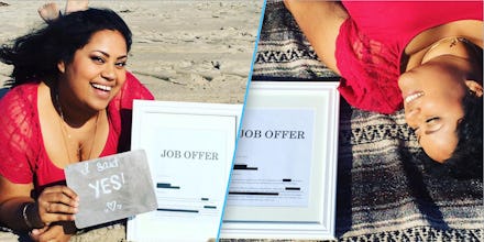 On Sunday, Abraham uploaded an album to her Facebook page showing her posing with an offer letter — there she was holding it in her arms on the beach, and celebrating their journey together from phone interview to final offer.