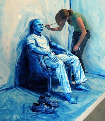 But Meade doesn't just stop with her subjects' bodies; she paints the entire surrounding area — walls, chairs, clothes, you name it— to create an incredible illusion that her subjects are actually in living paintings. Sometimes, she sends them out into the real world to mingle with unpainted people.