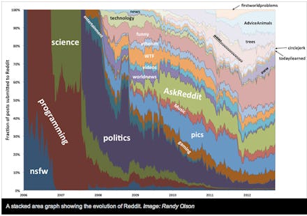 Despite the bad jokes, Reddit always has been somewhat of a haven for horny programmers (subreddits like r/gaming and r/gonewild (NSFW) have always been among the most popular), but as Olsen's graph demonstrates, it has become an increasingly diverse and open place for just about anything.