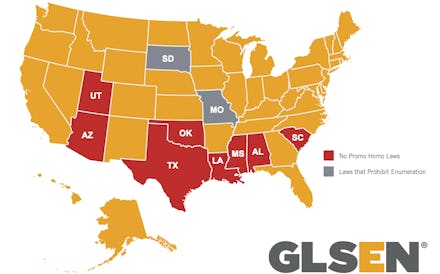While the situation in Russia is dire, it's hardly the only place to have instituted a law banning "gay propaganda." In fact, as a map from the Gay, Lesbian & Straight Education Network illustrates, eight U.S. states — Alabama, Arizona, Mississippi, Louisiana, Oklahoma, South Carolina, Texas and Utah — have laws banning the promotion of homosexuality in schools.