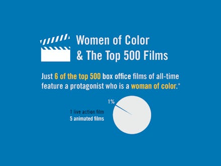In a new infographic, the Representation Project analyzed the top 500 films of all time based on worldwide box office numbers from Box Office Mojo, and found that just six starred a woman of color. That's 1% of the top 500 films — a startling stat that poses serious implications regarding how people of color and women are valued in society.