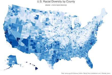Yet all is not melted in this melting pot of ours. A recent map by Randal Olson depicts how racially mixed each county in the U.S. actually is, and the results may surprise you: