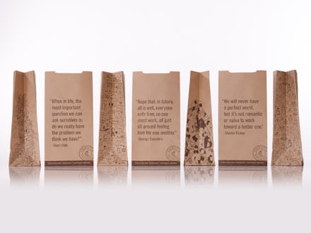 Spearheaded by Foer, the initiative is getting a few eyerolls on the Internet, but is a pretty revolutionary way to bring high-quality writing and thought-provoking ideas to the masses — not to mention a brilliantly sneaky way to introduce people to literary minds. If the choice is a bag with nothing on it, marketing copy or an essay by George Saunders, why not go for the thought-provoking reading matter?
