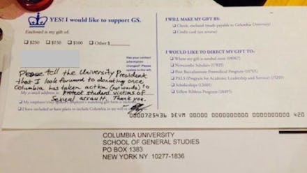 In a striking example of this attitude, one alumnus or alumna returned a donation card to Columbia University blank except for this note: "Please tell the university president that I look forward to donating once Columbia has taken action (not words) to protect student victims of sexual assault."