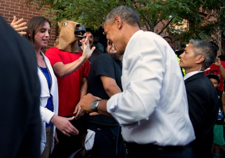 Luckily, not everyone has been attacking the president. Horsehead guy up there seems pretty harmless, and folks seem happy at the numerous unscheduled stops he's been making at restaurants and the like.