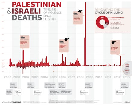 The news: As Israeli military forces make their way into the Gaza Strip in a major new ground invasion, this infographic from Visualizing Palestine has some perspective on the relative costs each side has paid in this entrenched conflict.
