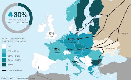 Russian foreign relations: Europe gets an estimated 30% of its natural gas from Russie, more than half of which enters European countries through Ukraine. The EU could feasibly compensate gas flows if Russia interrupted Ukraine's current flow, but that's contingent upon total cooperation of all European nations and Gazprom, the Russian energy giant.