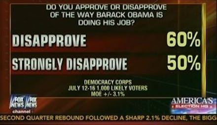 The news: Boy, this is odd. Fox News posted the following poll during July 30's edition of Special Report, which seems to indicate that 110% of voters in Senate battleground states disapprove of the president's job performance.