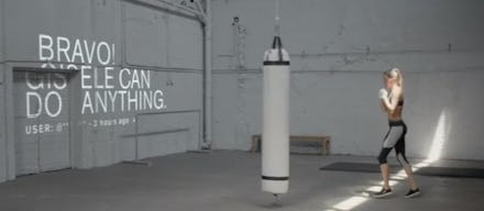 In the clip, Bündchen "looks like she's training for the UFC, not Fashion Week," AdWeek reported. And with every high kick that furiously strikes the punching bag or every push up done on the rings, real social media critiques and praise directed at her flash on the walls, alluding to the ever-present effect of being in the public eye.