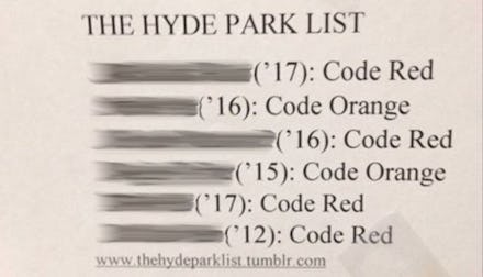 Originally posted to a Tumblr called The Hyde Park List, the list identified "people known to commit varying levels of gender-based violence" at the university. That first Tumblr iteration was quickly taken down, but it has since reemerged in a more abridged version. Copies of the list also began appearing in campus bathrooms this past weekend during the start of freshman Orientation Week.