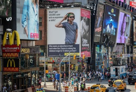 Alongside the usual flashing lights and sky-high billboards, visitors to New York City's Times Square will now see an ad mocking calls for a higher minimum wage and belittling low-wage workers. The massive sign comes courtesy of a restaurant industry-backed advertising firm fighting Democratic Gov. Andrew Cuomo's endorsement of a $15 minimum wage for fast-food workers.