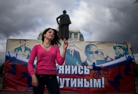 The fun didn't stop there. Moscow's Red Square transformed into a souvenir mecca where sellers sold T-shirts and sweaters adorned with Putin's pasty face. In Chechnya, a parade filled with thousands of supporters formed a 2,000-foot-long Russian flag.