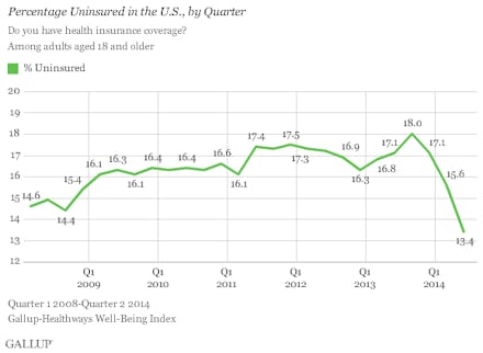 Between 2013 and first three months of 2014 alone, the Centers for Disease Control and Prevention reports that the number of uninsured adults dropped most significantly for those ages 19 to 25. The percentage of uninsured fell from 26.5% to 20.9% in the period of 15 months. America's uninsured rate now sits at 13.4%, which Gallup reports is the lowest it's been since they began tracking rates in 2008: