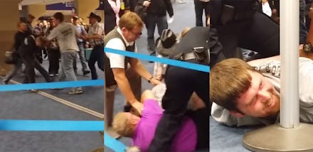 Bystanders rushed in as soon as the fight started. The man who started the fight claimed he fought because "this is America." He then said he'd "beat the shit out of" the pink-shirted man soon enough.