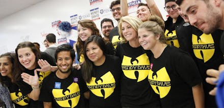For the uninitiated: The shirts are a play on the logo of the Wu-Tang Clan, the New York City-based hip-hop group. The back reads "Wendy Davis is for the Children," which is an homage of sorts to the time that late Wu-Tang Clan member Ol' Dirty Bastard rushed the stage at the 1998 Grammy Awards and uttered the line, "Wu-Tang is for the children."