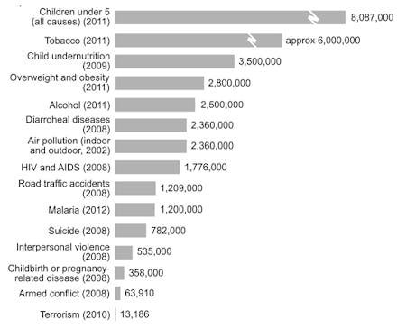 In fact, terrorism isn't even close to the top cause of death around the world. Child mortality, tobacco, child undernutrition, obesity and alcohol all kill far more people each year. Despite the fact that child mortality is currently at its lowest level in decades, there's still a long road ahead for addressing it worldwide. Between 1990 and 2013, 223 million children across the globe died before turning 5, which comes to around 17,000 preventable deaths every day.