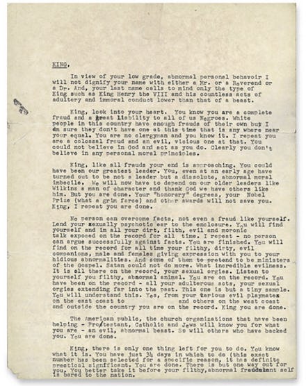 One of Hoover's deputies wrote the letter, which is packed with such a cartoonish density of pejorative language that King and his peers immediately determined that it was the work of the FBI.