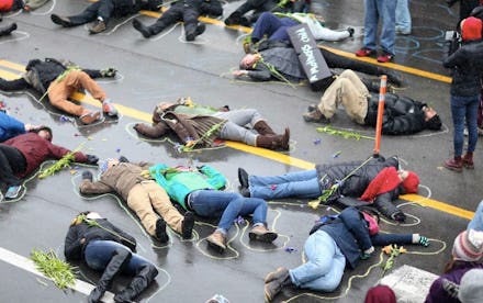 Braving the cold and the snow, more than a hundred people gathered on the streets of St. Louis Sunday, temporarily blocking a major intersection in the process. Reuters reported that dozens of people staged a "die-in" — which involved some protesters pretending to have been shot by others acting as police officers — as a way of honoring Brown's memory.