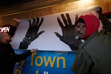Davis' project relies on the owners' cooperation. He hasn't hung a single sheet without their permission, and while many businesses support the protesters' efforts — letting the artist and his cohorts adorn their facades with these "hands up" posters, symbolizing the gesture Brown was allegedly making when Wilson gunned him down — other businesses prefer to remain "neutral," Davis said.