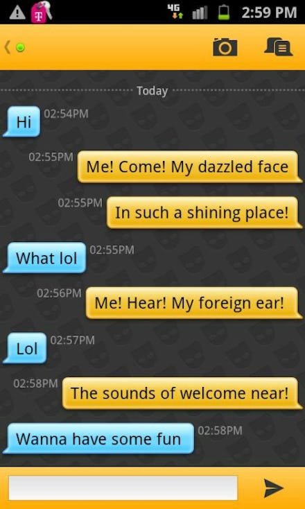 Using the ubiquitous gay dating app Grindr, Grindr Texts From Emily takes lines from her archive of more than 1,800 poems to respond to potential suitors, bringing Dickinson's poetry to "the land of hook-ups, dick pics, and other non-subtleties." While Dickinson could not stop for death, she may well have stopped for a few of these earnest would-be partners. Take a look: