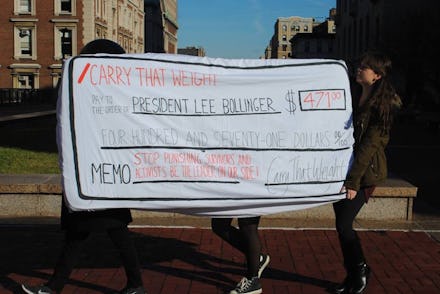 This simple act has since become a national phenomenon, however, resonating on campuses across America. Throughout the fall, fellow students helped Sulkowicz carry her mattress all over campus. The protest culminated on Oct. 28 when the contingent delivered 28 mattresses on Columbia President Lee Bollinger's doorstep. His response? "Having the mattresses thrown in dumpsters and slapping us with a $471 fine," the group says on their Facebook page. "This shows that he would rather throw out survivors’ pain than acknowledge the harm his administration has caused. It's reprehensible to make us pay for the trauma that we have endured."