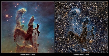 This time, Hubble also captured an image taken in infra-red light, which "penetrates much of the obscuring dust and gas and unveils a more unfamiliar view of the pillars," according to the website. "Here newborn stars, hidden in the visible-light view, can be seen forming within the pillars themselves."