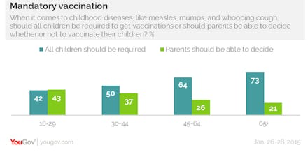These same young adults were also dramatically less likely to support mandatory vaccinations for all children than older generations, with slightly more — 43% — in support of letting parents decide than requiring all children to receive the shots: