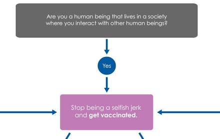 Make sense? Great! Now say it together, folks: Vaccinations aren't about me. Vaccinations aren't about me. Vaccinations aren't about me.