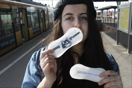 A young woman named Elonë, from Karlsruhe, Germany, is paving her city with messages against sexism, street harassment and sexual abuse — all printed on menstrual pads.