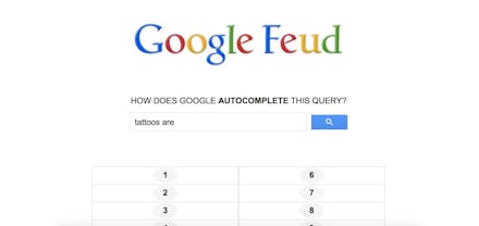 Google Feud, not officially affiliated with either the game show or the search engine, nonetheless plays by the show's rules: Guess the most frequently Googled queries until you come up with the top ten. Give three wrong answers and the round ends. It's simple enough, which makes it all the more addictive.