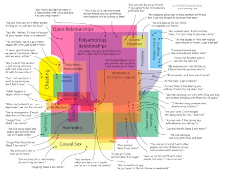 The chart helps give voice to myriad intersecting relationship structures out there. There's the "100-Mile Rule," which the chart expresses as "We're monogamous. Except when he's on the road." Or the closed-group swinging set, which can be explained as "We like swinging, but only with Bob and Alice." (Then, of course, there's non-monogamy without communication or consent, otherwise known as cheating.)