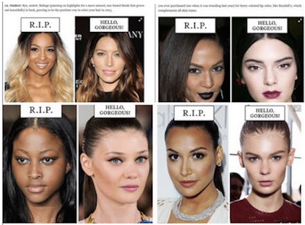 The article, "21 Beauty Trends That Need To Die in 2015," presents a series of split images: on the left, trends "that need to die," and, on the right, new "Hello Gorgeous!" trends to ring in the new year.