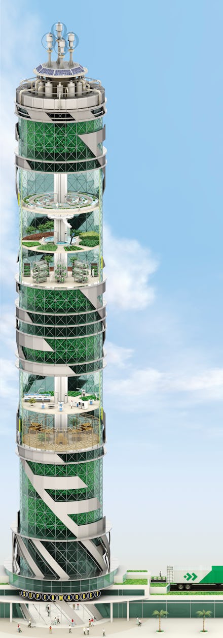 This isn't a new phenomenon. At least not completely. Highrise farms have become increasingly likely to replace traditional big-field farms as a means of feeding the planet. In 2011, Japanese plant physiologist Shigeharu Shimamura turned an old Sony factory into a 25,000-square-foot indoor farm, partnering with General Electric to use LED lights for growing 10,000 heads of lettuce every day. This resulted in a system that was allegedly 100 times more productive than traditional means. And in general, urban skyscraper gardens have been in the conversation for most of this decade.