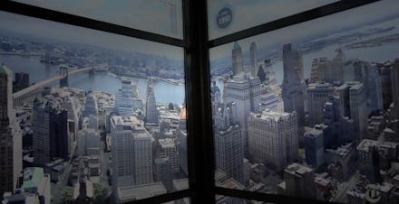 Before finally arriving at the observatory deck 1,268 feet up, the scaffolding and mammoth steel skeleton of 1 World Trade Center assemble and knit together around the car, signifying the new center's construction and completion, before finally ending in a video version of what's probably on the other side of the screens: an elevator shaft with the blocky-lettered floor number, 102.